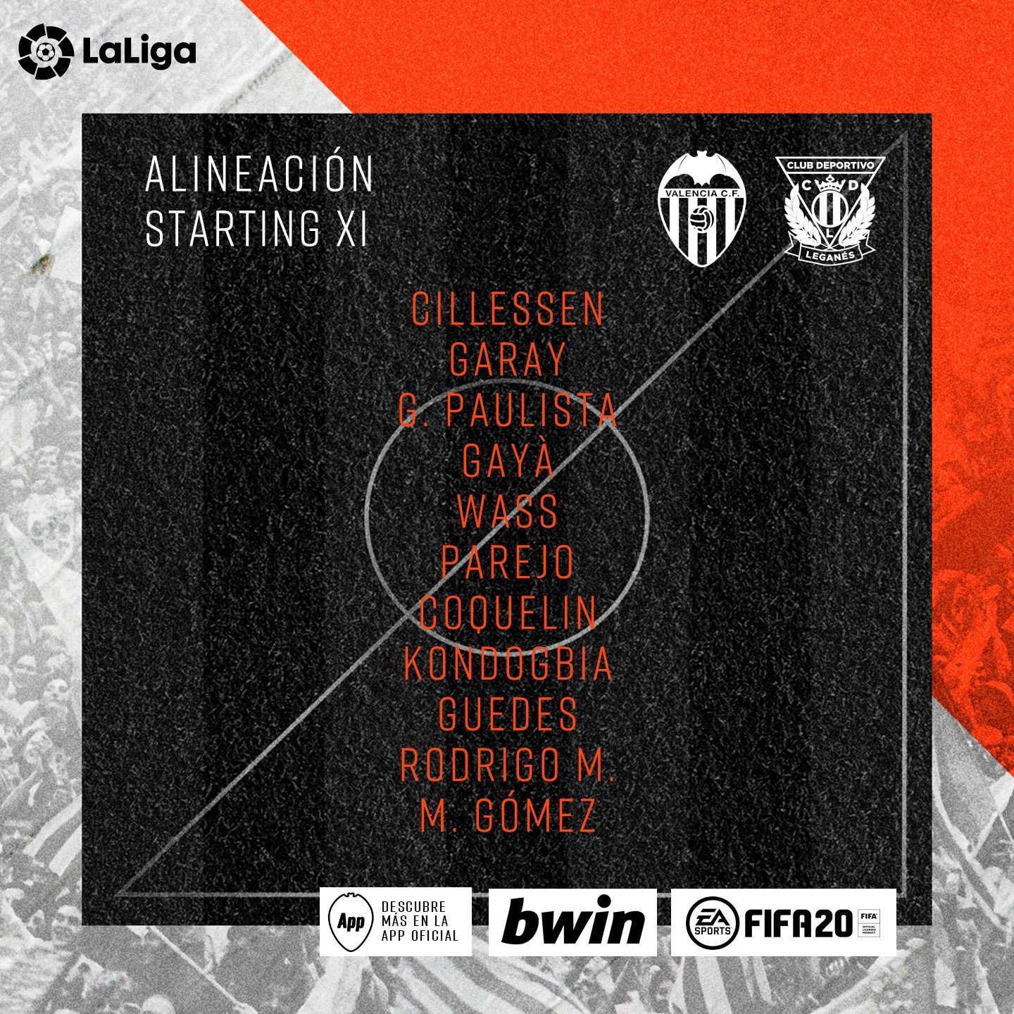 Lineup is largely the same from the Chelsea game. The defense 4 maintain their hold on the positions, Coquelin and Kondogbia start together again with Parejo in midfield and Rodrigo gets another start after his goal last game. The two changes are Guedes returning to the lineup instead of Cheryshev and Maxi Gomez earning his first start over Gameiro.