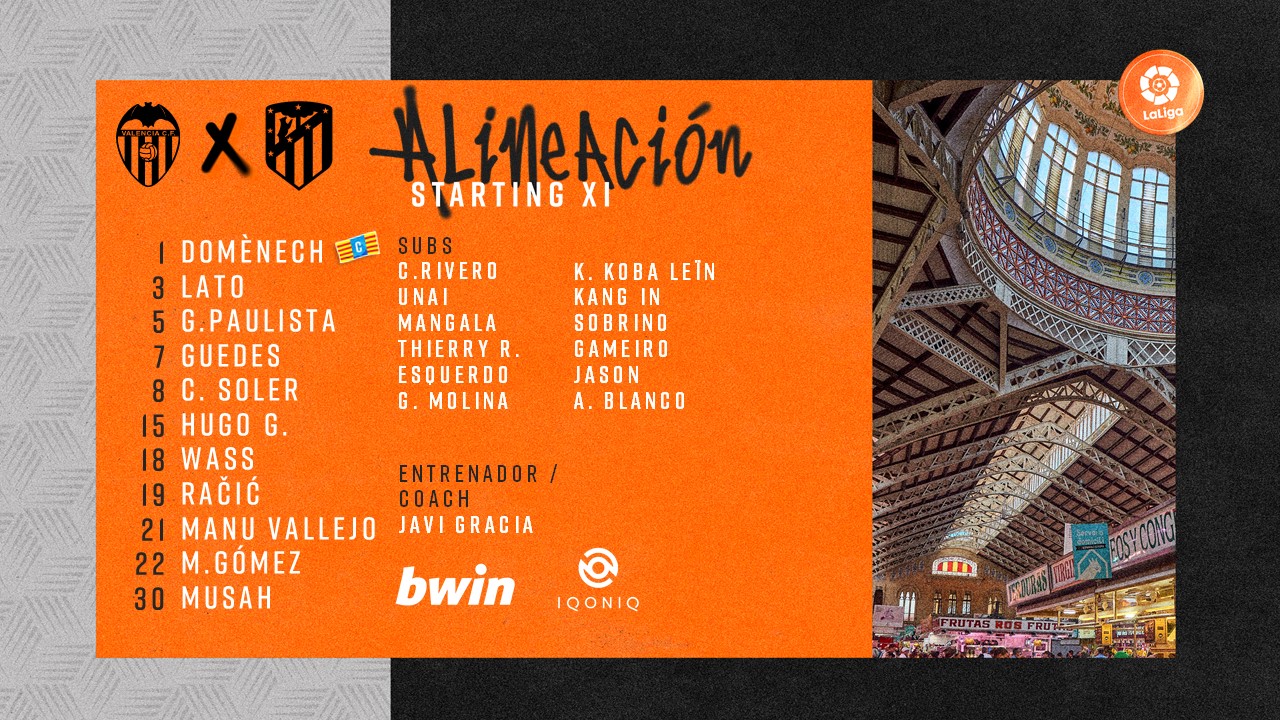 22' - Great team play from Valencia. Guedes and Musah link up with one-two on the right flank before Guedes finds Soler at the edge of the area. Soler sends a well-timed lob over the defense to pick out Racic who had snuck in behind the defender on the left. Racic takes a shot at goal but Oblak parries it out for a corner. The shot looked more like a scuffed cross. Maxi Gomez was asking it for it in the center.
